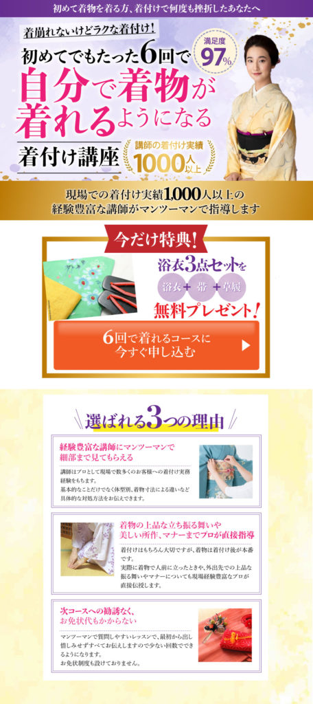 着付け教室 PC/SP 2024 4/19 ランディングページ 2024年2月26日2024年4月19日 PC版 SP版 トンマナ解釈 全体的に中間色が多い。アクセントに黄色やクリーム色。季節感を表すのに緑や桜色も。丸、四角、菱形を使った安定的なレイアウト。明朝体が多い。ほかに手書きフォント系。縦書きも少しある。 制作時間:14時間使用アプリ:Adobe Illustrator ランディングページ
